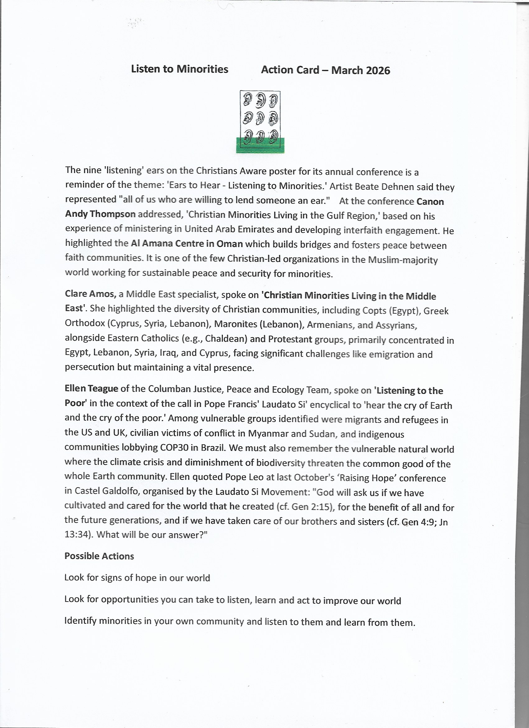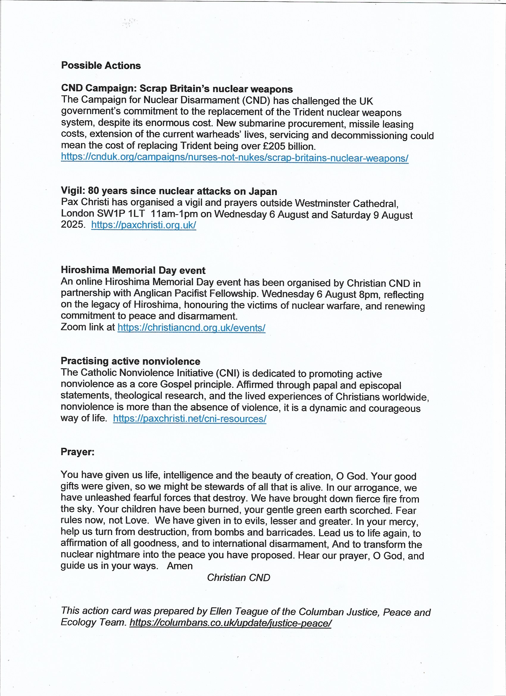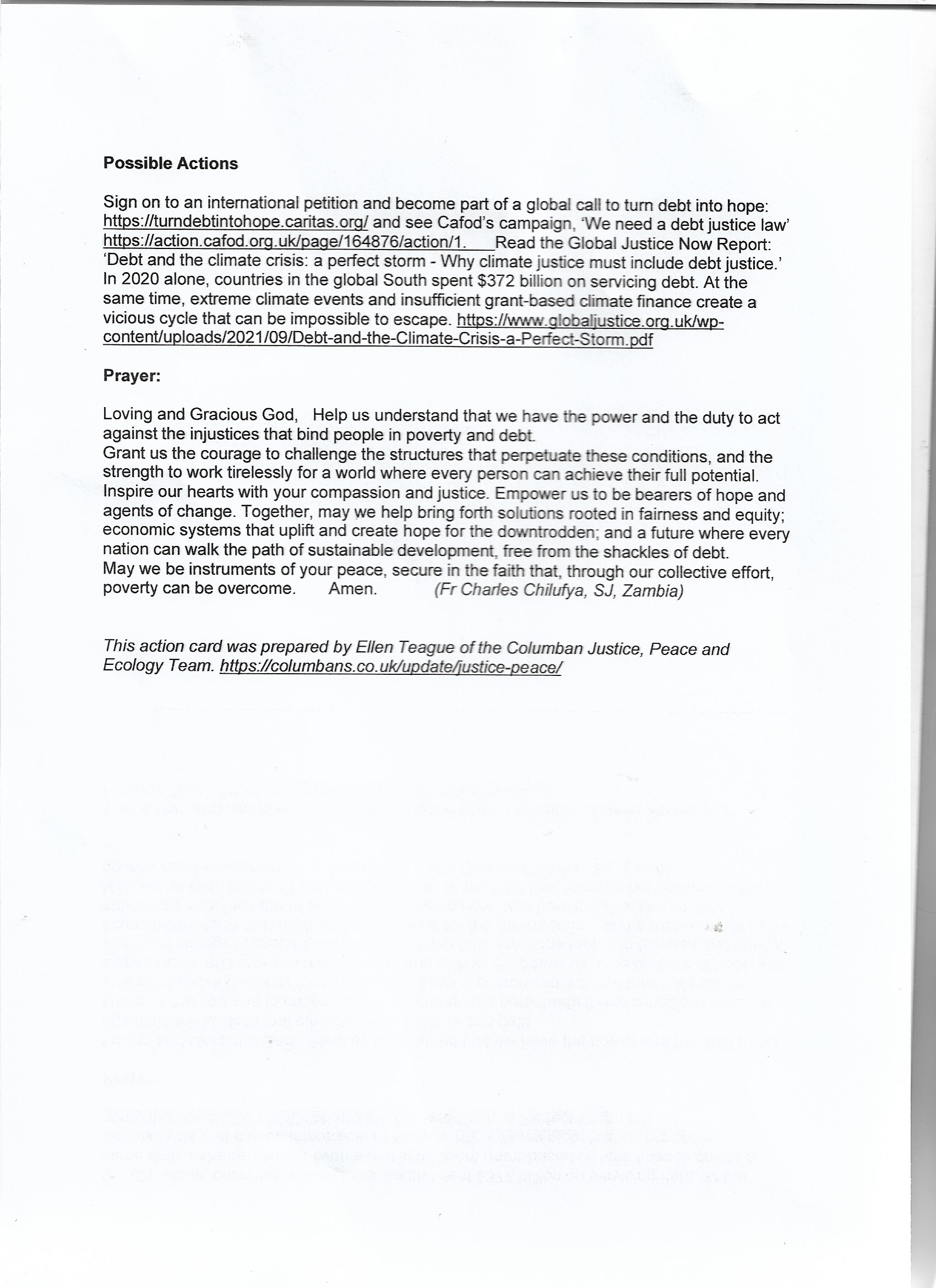 This action card was prepared by Ellen Teague of the Columban Justice, Peace and Ecology Team. https://columbans.co.uk/update/justice-peace/