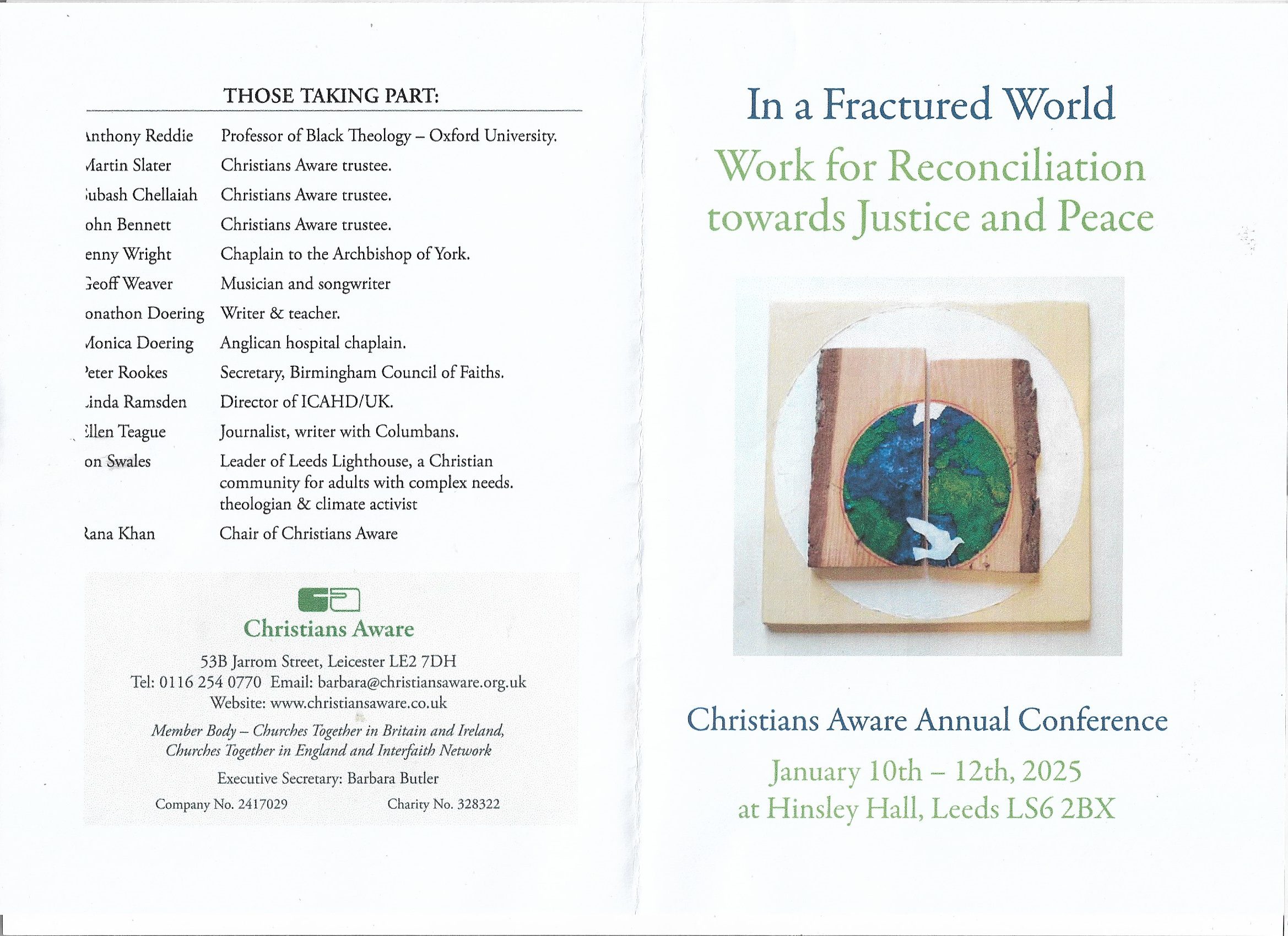 Christians Aware’s Conference in January 2025 was on the theme of reconciliation. We had some excellent speakers, opportunities for prayer and reflection, workshops and a service at the end of the weekend.